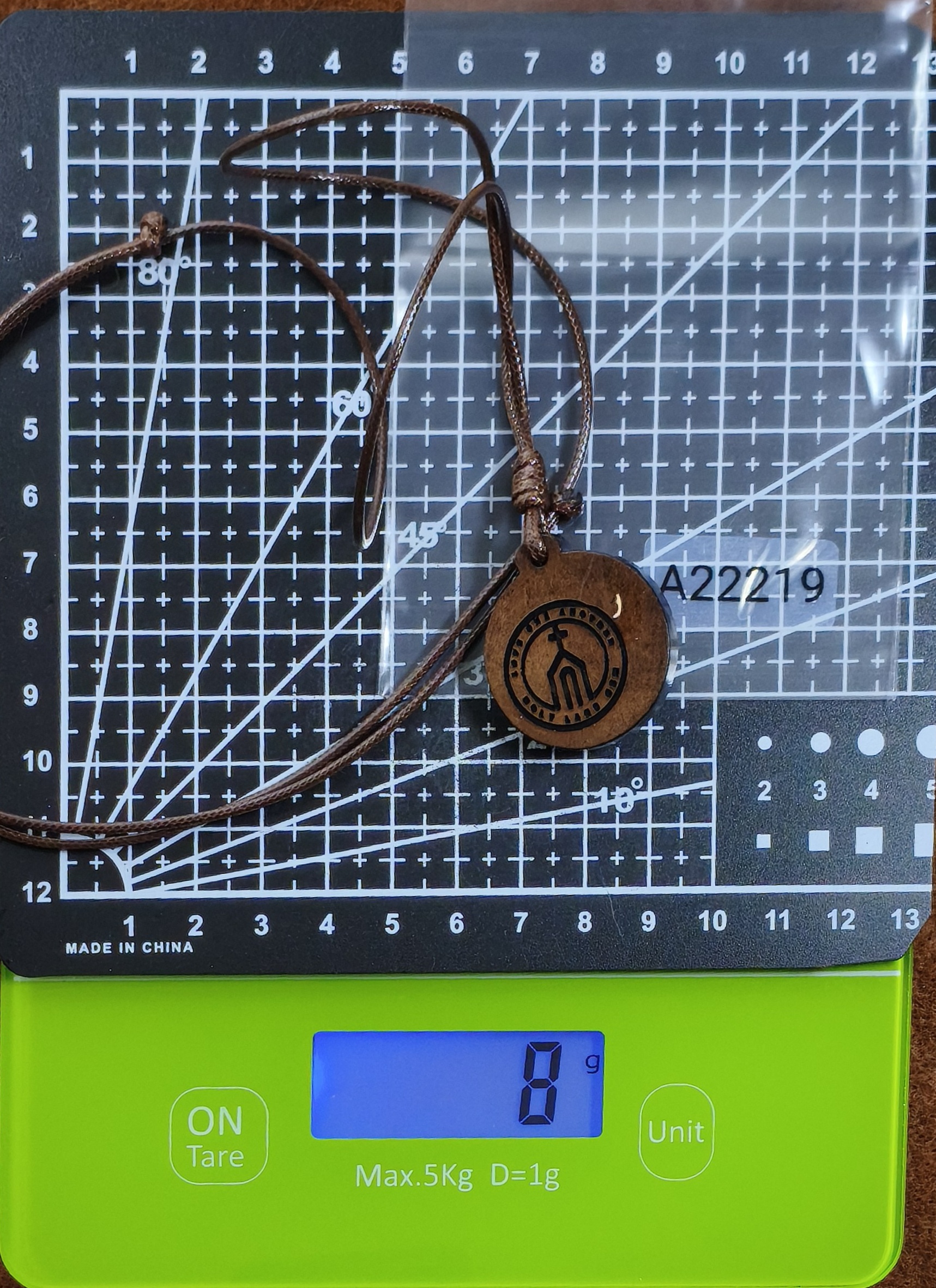 The necklace is simple and made of epoxy-coated wood with decorations, an adjustable chain made of leather.